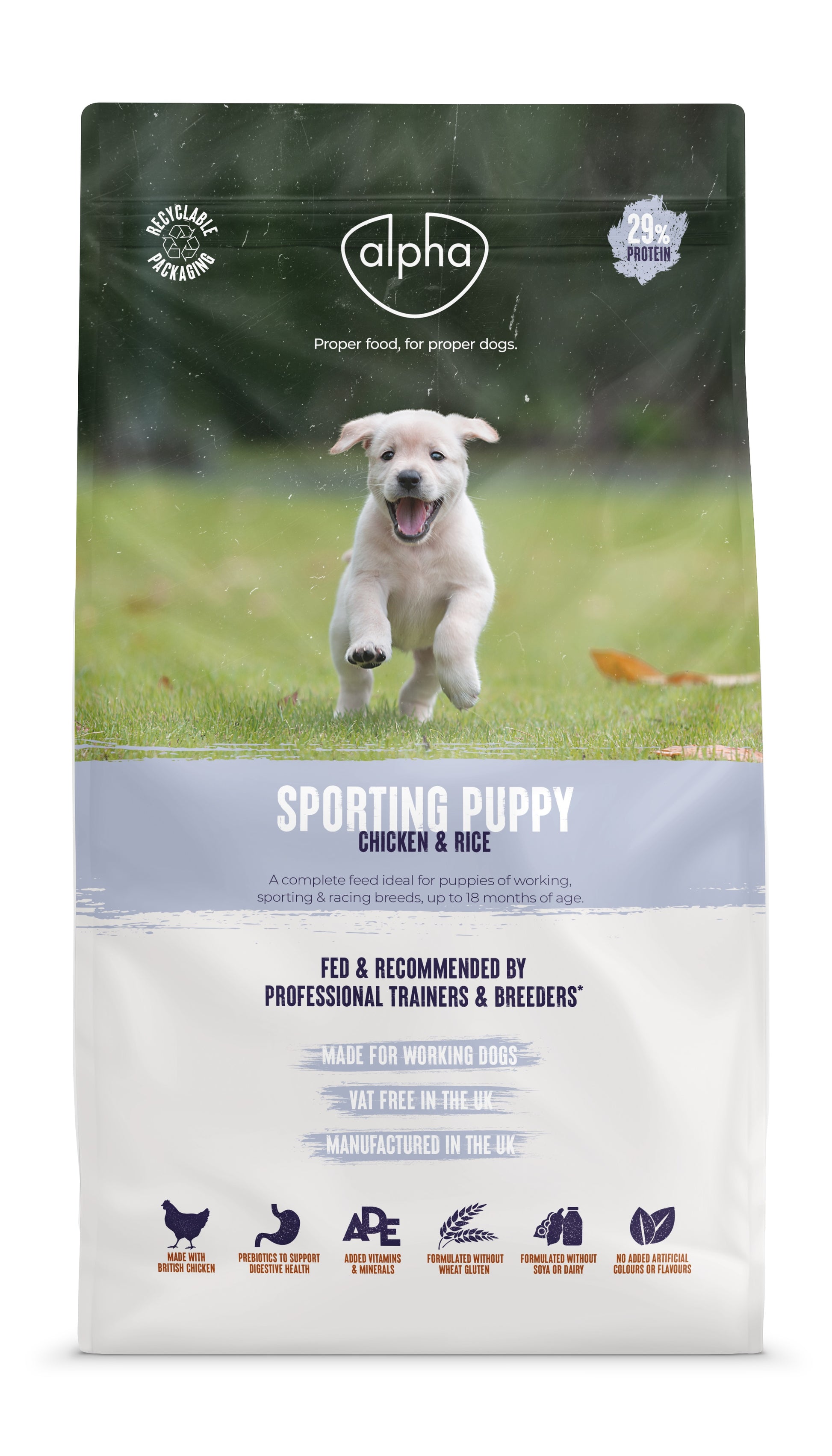 Alpha Sporting Puppy Chicken & Rice is a complete hypoallergenic ‘wheat gluten free’ food nutritionally formulated to provide puppies of sporting working and racing breeds with the essential ingredients for the best possible start in life. Suitable for puppies up to 9 months of age. Using only the highest quality ingredients that have been carefully cooked and fortified with a range of minerals and vitamins to ensure that your puppy receives all the protein carbohydrates vitamins minerals and oils essential for steady growth during their first and most crucial stages of development. Despite how well your sporting puppy is bred they cannot fulfil their natural potential if their diet does not provide their bodies with the essential nutrients they require for optimal growth and development.