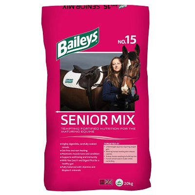 Baileys No.15 Senior Mix has been designed to help older horses continue to digest their food more efficiently & maintain or even improve their condition. It is able to do this by providing non heating fibres with excellent levels of quality proteins that benefit ligaments & tendons as well as muscles. Digest Plus Prebiotic has been included into the mix this helps promote gut efficiency by giving beneficial gut bacteria the food it needs to be more efficient in its actions. A full profile of vitamins & chelated minerals help boost overall health & well-being.