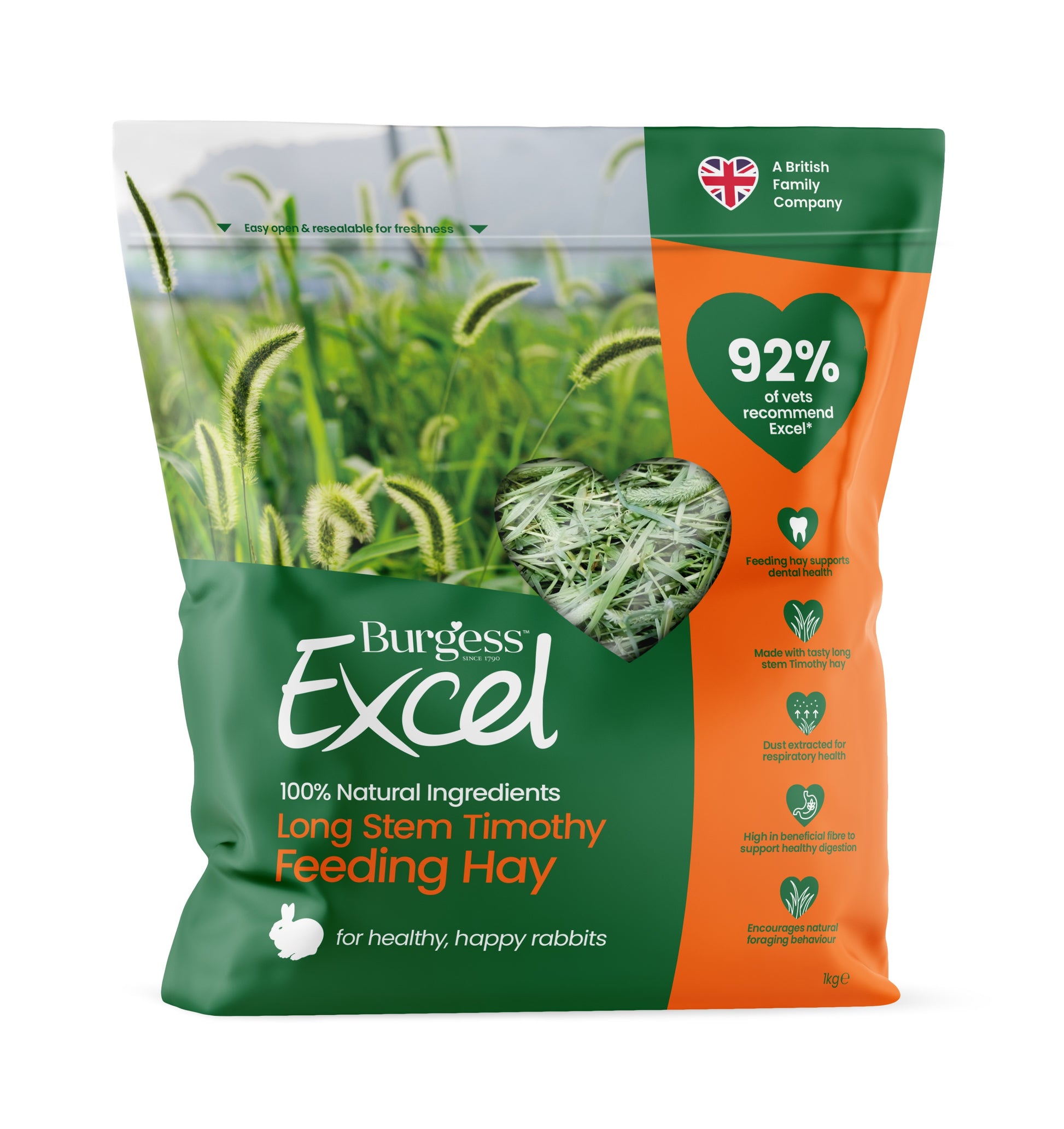 Burgess Excel Long Stem Feeding Hay is made from top quality timothy hay grown on a Yorkshire farm which has been cut at the perfect time to provide our rabbit with more nutrients than standard bedding hay. The hay has been dust extracted for respiratory health whilst its fresh fragrance encourages foraging and other natural behaviours.