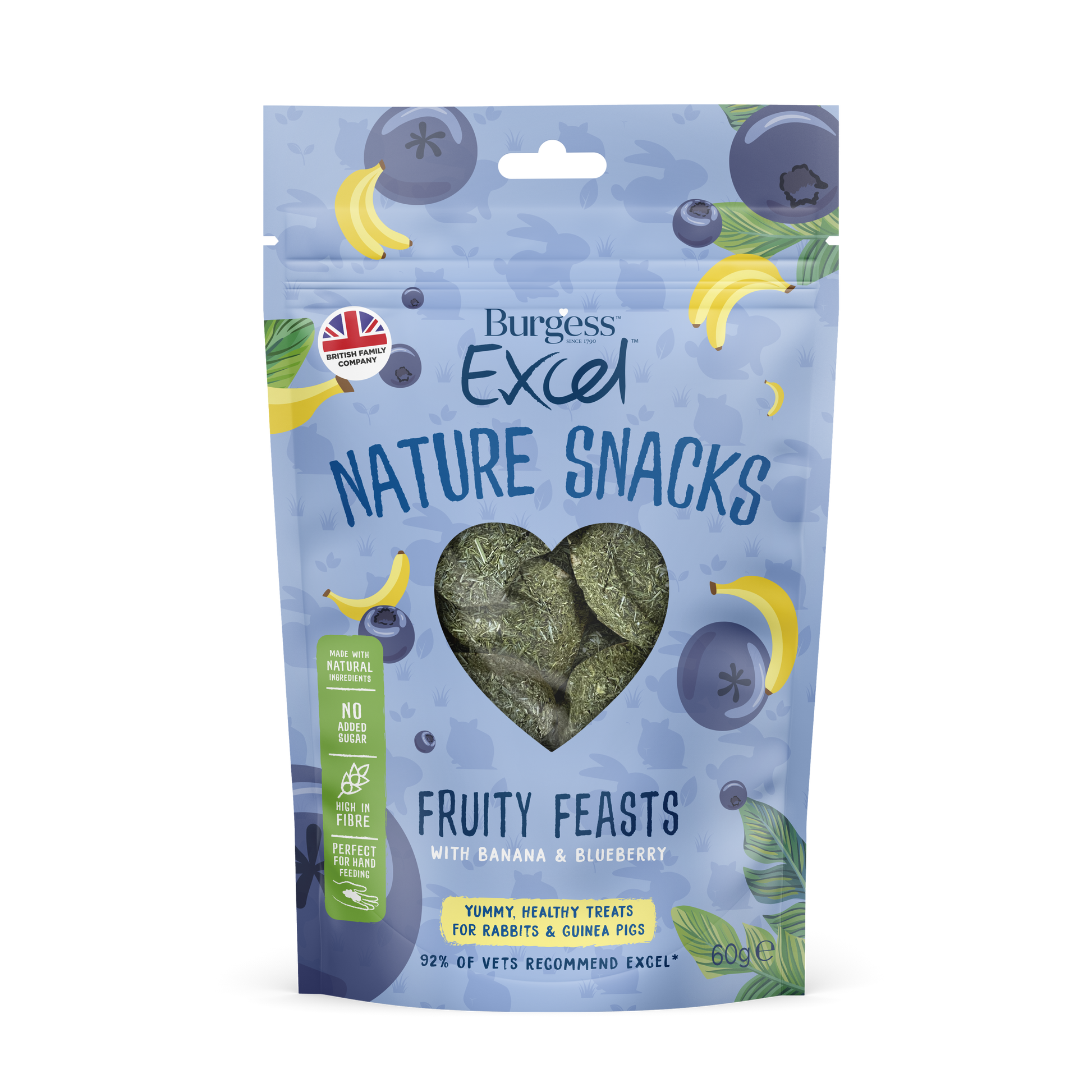 Burgess Excel Nature Snacks Fruity Feasts. Baked with love Burgess Excel Fruity Feasts are irresistible to rabbits and guinea pigs and are naturally healthy too. With no added sugar or artificial colours or flavours Burgess Excel Fruity Feasts are a complementary feed for rabbits and guineas pigs.