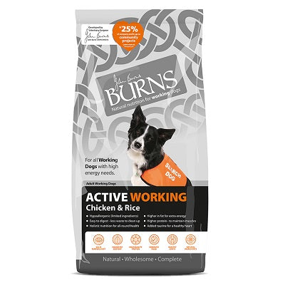 Burns Active Working with Chicken & Rice Dog Food has been developed to meet the higher energy and nutritional requirements of active working dogs. Active Chicken & Rice contains everything an active adult dog needs for health and vitality. This delicious premium quality food is formulated with carefully balanced ingredients to provide all the essential nutrients an active dog needs.