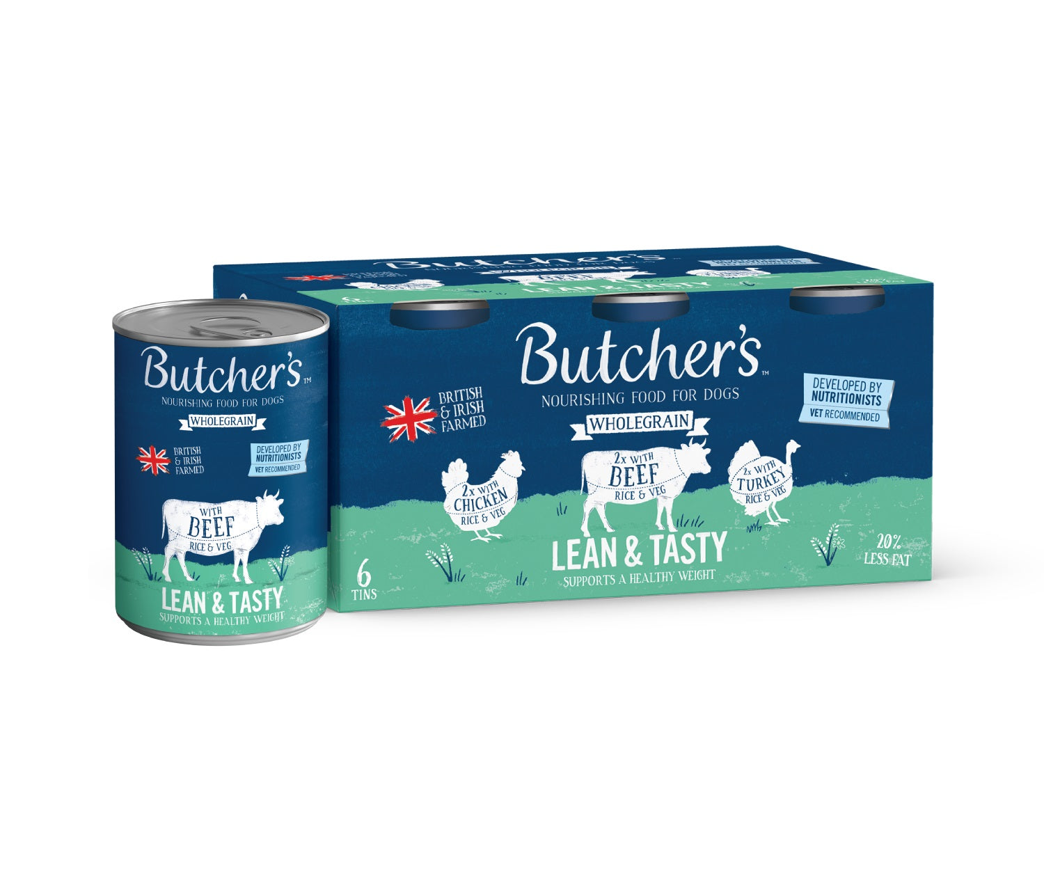 Butcher's Wholegrain Lean & Tasty. Our Lean & Tasty 6 pack recipes are 20% less fat and still full of natural goodness. Every recipe is Vet Recommended and carefully created by our Nutritionist to have exactly the right amount of naturally active ingredients to help maintain a healthy weight. These 100% complete & balanced wholegrain recipes are a lighter meal than our regular recipes perfect for supporting an overweight dog diet. They contain L-Carnitine which helps to convert fat into energy to maintain lean muscle and wholegrain rice is a great source of fibre and slow-release energy to ensure your dog is full of energy.