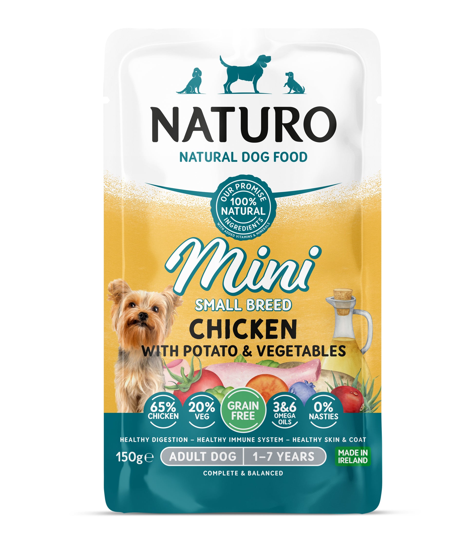 Naturo Adult Mini Grain Free Chicken with Potato & Veg Pouches. Our Grain Free Wet Dog Food recipe is specifically made for dogs who suffer from sensitive tummies with ingredients carefully selected to help promote a healthy digestive system and a happy healthy dog. We are confident your dog will enjoy our delicious natural dog food recipe containing 60% Chicken and 26% Potato. Chicken is an excellent source of quality protein with B vitamins to support healthy muscles and energy delivery. This essential mix of protein carbohydrate and fibre creates an easier digested product for your dog. Omegas 3 and 6 are included in Sunflower and Salmon oils to help maintain healthy skin and promote a healthy coat for your adult dog throughout its life. Naturo contains 100% natural ingredients with added vitamins minerals and calcium to support your dog’s immune system teeth and bones. Our recipe contains no added artificial colours flavours or preservatives providing the best natural hypoallergenic dog food for your dog. Our premium healthy dog food provides the best option for pet-parents who want nutritious and balanced meals to support their dog’s health and well-being at all life stages.