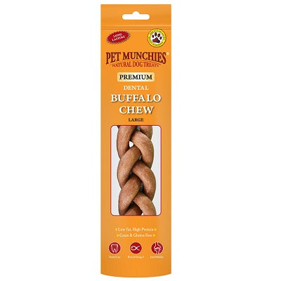 Pet Munchies Buffalo Chews. Premium gourmet dental chew made with 100% natural human- grade grass fed Buffalo. This healthy chew is infused with salmon oil which is good for skin and coat joint mobility due to the rich levels of Omega 3. Long lasting and designed to satisfy your dog's natural instinct to chew to help reduce tartar and plaque for healthy teeth and gums to support good oral health. Grain and gluten free. Low in fat high in protein with no artificial colours or flavours makes this the ultimate chew.