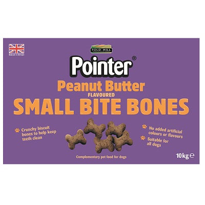 Pointer Small Bite Peanut Butter Flavoured Bones. A naturally wheat free dog treat with Peanut Butter flavour is oven-baked in the shape of a bone. These delicious tasting dog treats make for the perfect snack or training aid.