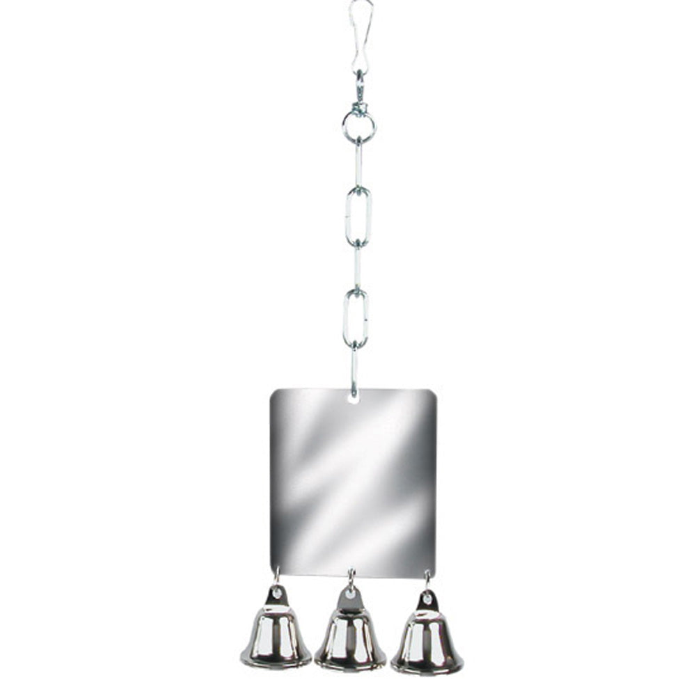 The mirror can be hung from wire rooftops via a galvanized metal chain and comprises a dangling bell to appeal to your bird's senses.