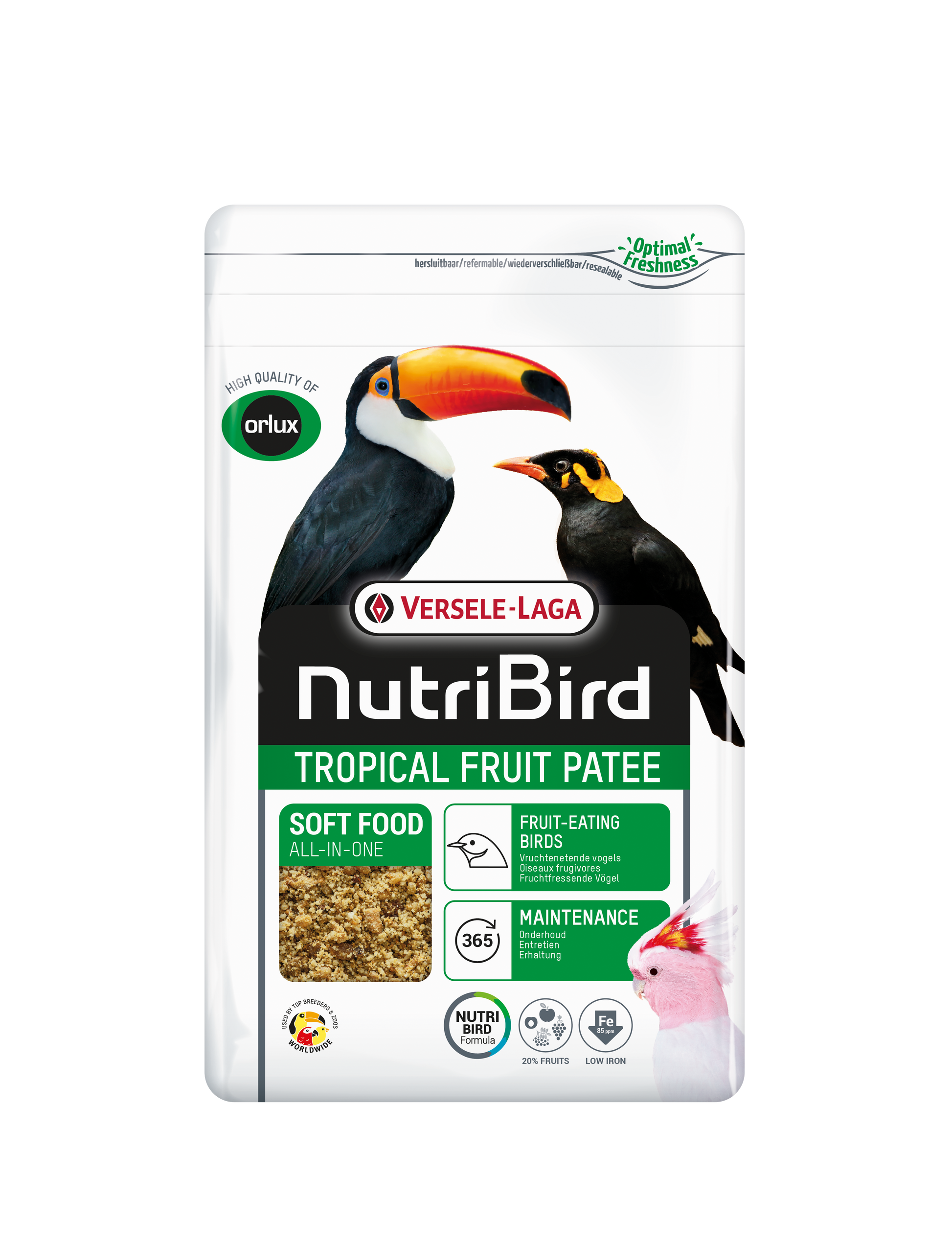 Versele Laga Nutribird Tropical Fruit Patee. Complete feed for all fruit-eating birds with 25% dried fruits: apricots pineapple papaya apple rowan ash berries and raisins. Has a coarse structure for a better assimilation with spirulina.